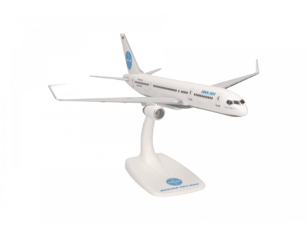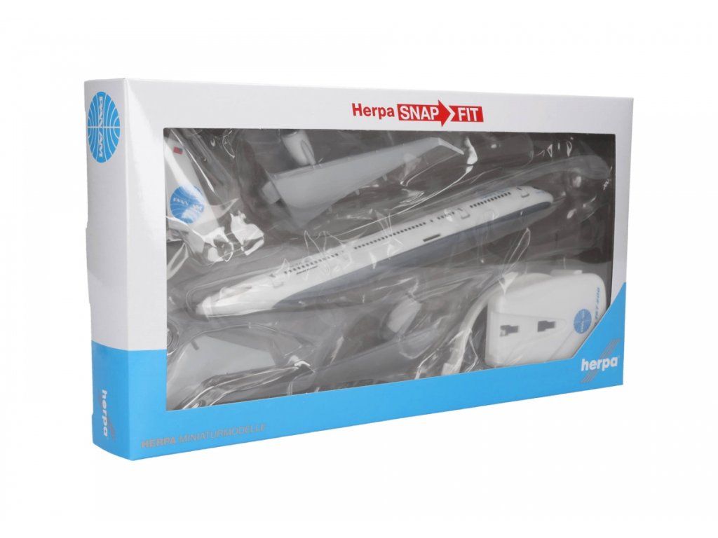 A plastic airplane model, known as snap-fit. It is a partially assembled, pre-painted model. Assembly is simple, without the need for glue. The model does not include an undercarriage but comes with a stand for easy display.